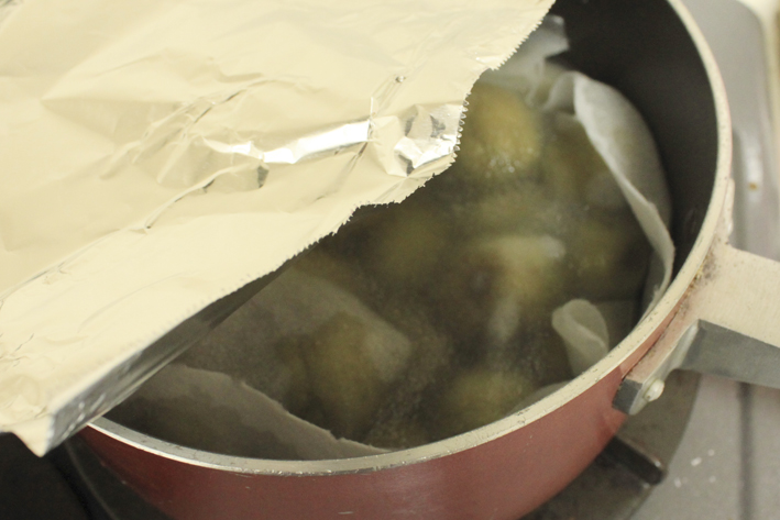 厚手のキッチンペーパーで落とし蓋をして、