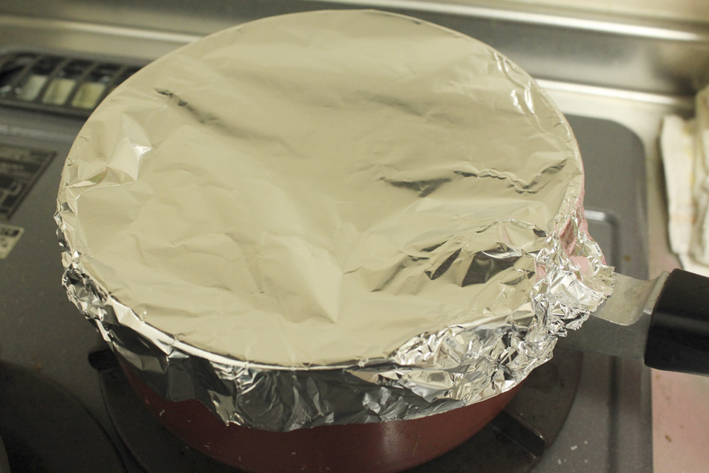 アルミホイルでお鍋を包むように蓋をします。