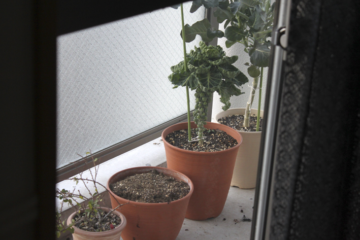 芽キャベツの葉っぱをつんつんやっている輩が。